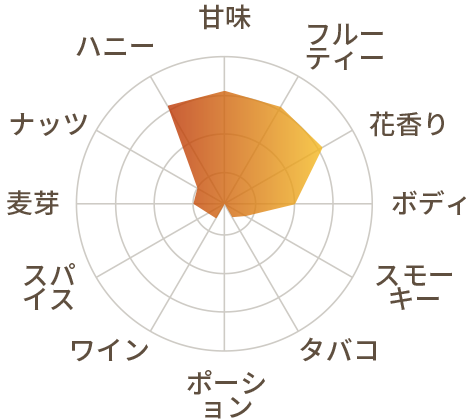 ライチの甘さが軽くクリームハメの香りを包んで、バーボン樽をより豊かに表現し、静かで潤いの香りを放っています。口当たり