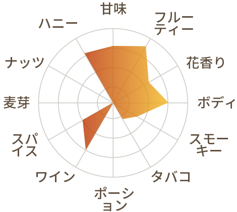 熟しているバナナの甘さを散らし、その後はブラッククイーンの香りですが、そのなかにドライフルーツの甘み、辛料と焼きトーストの香りが混ざっています。どん底にある穏やかな白檀は、梅干しとクリームの息吹をゆっくり吐き出しています。余韻